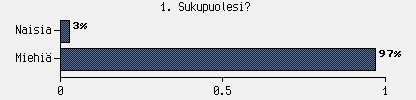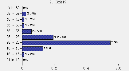 Kuten odotettavissa oli, lukijakunnan miesvaltaisuus ei edelleenkään ole merkittävässä määrin hellittänyt. Viime lukijakyselyn vastaajista naisia oli kolme (1,1 prosenttia), nyt viisi. Toisaalta voidaan tässä nyt edes hiukan lohduttautua sillä, että naisten prosenttiosuus on kasvanut lähes kolminkertaiseksi. :)