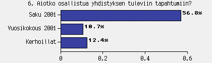 Kuten aiemminkin, suuret tapahtumat innostavat useampia lähtemään mukaan kuin pienet, ja uudelle Saku-tapahtumalle on selkeä tilaus. Noin 20 prosenttia ei ole suunnitellut osallistuvansa tapahtumiin lainkaan. Mielenkiintoisena yksityiskohtana mainittakoon, että muutama vastaaja, joka ei ollut jäsen koska ei mielestään saavuttaisi jäsenyydellä yhtään mitään etua, oli kuitenkin varsin kiinnostunut osallistumaan Saku 2001 -tapahtumaan. Pardon me, mutta eikös se tapahtuma ole etu? ;-)