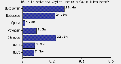 Suurin osa vastauksista jakautui muutaman yleisimmän selaimen kesken. Jos vastaaja oli maininnut useamman ohjelman, valittiin se jota hän ilmoitti käyttävänsä eniten tai joka oli mainittu ensimmäisenä. Muut-kohtaan sijoitettiin esimerkiksi Mozilla- ja Lynx-käyttäjät sekä ne vastaukset, joissa selainta ei ollut ilmoitettu. Tuloksista nähdään ainakin se, että kotisivujen ja lehden suunnittelu toimimaan kaikilla selaimilla on todellakin tarpeen.