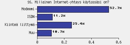 Nopeat liittymät eivät vieläkään ole levinneet joka niemeen, notkoon ja saarelmaan, mutta kasvuvauhti näyttää hurjalta. Joka neljäs vastaaja on jo kiinteän piuhan päässä! Vaikka modeemi on yhä yleisin ratkaisu, on ISDN sentään jo aika selvästi jäänyt kiinteän liittymän jalkoihin. Kiinteillä ilta- ja viikonlopputaksoilla markkinoitu ISDN-yhteys saattaa kuitenkin jatkossa syödä prosentteja modeemien osuudesta.