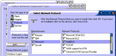Jotta Windows voisi jutella Samban kanssa ja käyttää sen levyjakoja ja itse jakaa niitä, pitää siihen tehdä muutamia asetuksia. Ensinnäkin tarvitaan NetBEUI-protokolla, jotta se puhuisi samaa kieltä Samban kanssa. Tämän voit asentaa ottamalla oikealla hiiren nappulalla "Ominaisuudet" Verkkoympäristö-ikonista. Tämän jälkeen klikkaa "Lisää" ja valitse "Protokolla", sitten "Microsoft" ja sieltä tuo tarvittava NetBEUI.